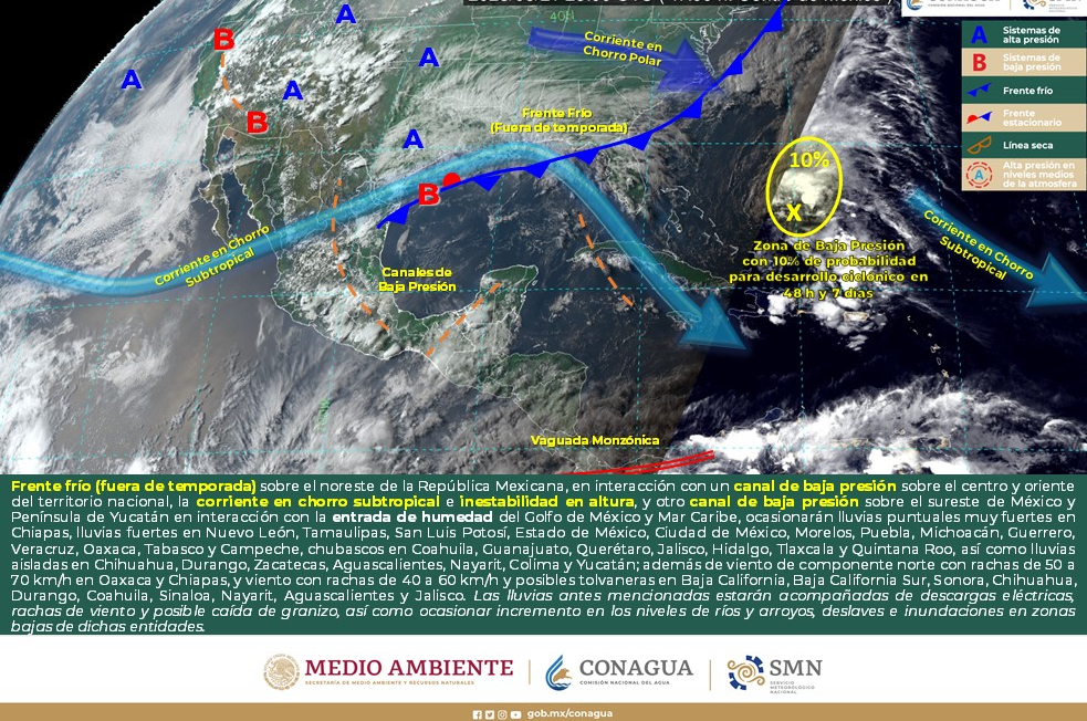 Viento con rachas de 40 a 60 km/h y posibles tolvaneras: Baja California, Baja California Sur, Sonora, Chihuahua, Durango, Coahuila, Nuevo León, Tamaulipas, San Luis Potosí, Sinaloa, Zacatecas, Aguascalientes, Nayarit y Jalisco.