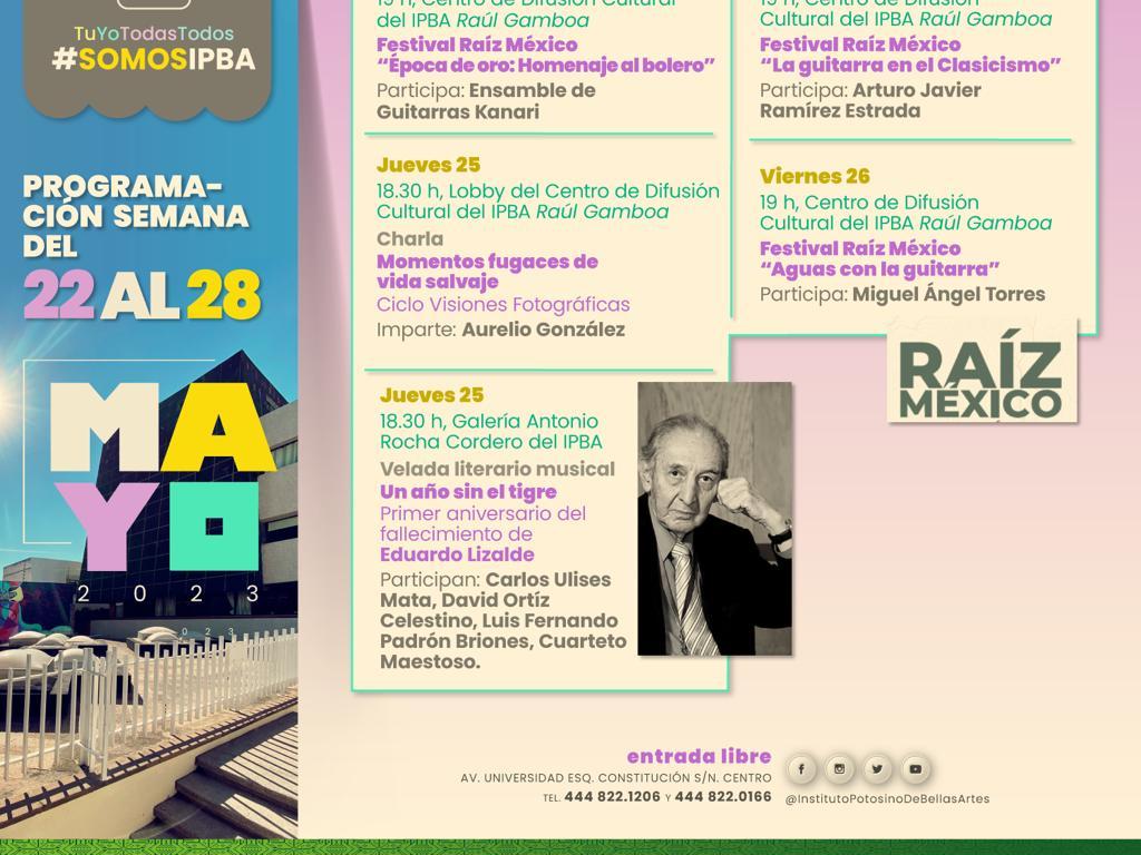 Por otra parte, la Galería Antonio Rocha Cordero del IPBA será sede de la Velada literario musical “Un año sin el tigre: primer aniversario del fallecimiento de Eduardo Lizalde”, a las 18:30 horas, con la participación de: Carlos Ulises Mata, especialista en la obra de Elizalde originario de León Guanajuato, conversando con David Ortiz Celestino y Luis Fernando Padrón Briones; modera: María Eugenia Urbina. Se contará con una intervención musical del Cuarteto Maestoso, José María Espinosa (Piano) y Jacqueline Medina (Soprano).