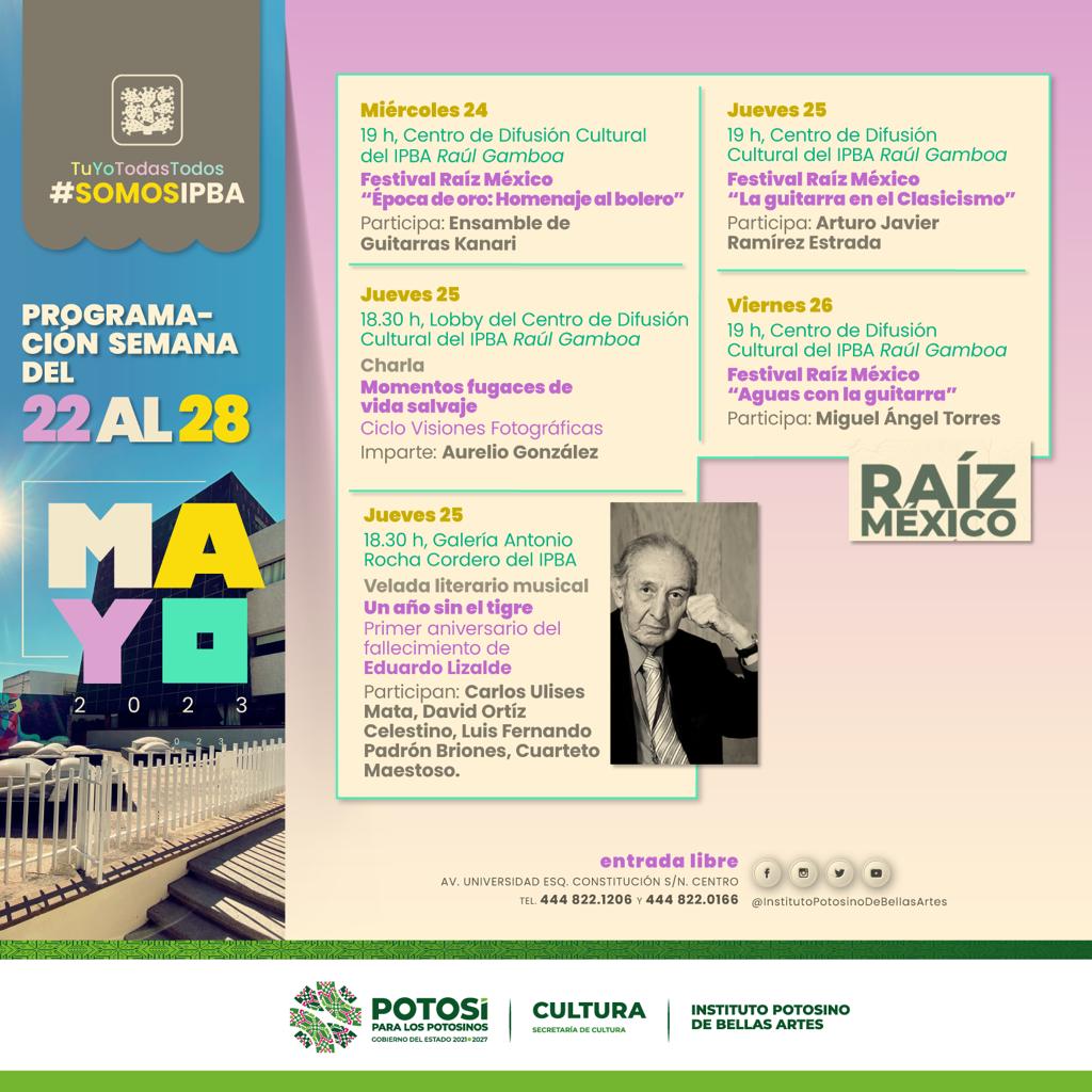 La Secretaría de Cultura de San Luis Potosí invita al público en general a participar en los eventos que esta semana se estarán llevando a cabo en el Instituto Potosino de Bellas Artes, en la última semana de mayo 2023, con entrada libre.