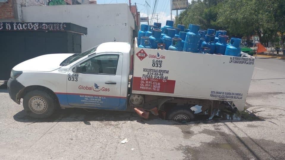 Esta día miércoles 24 de mayo ocurrió un accidente a una Camioneta de Global Gas al caer en “boquete” asfáltico sobre la calle Mariotte esquina con Av. Salk, en la Colonia Progreso.