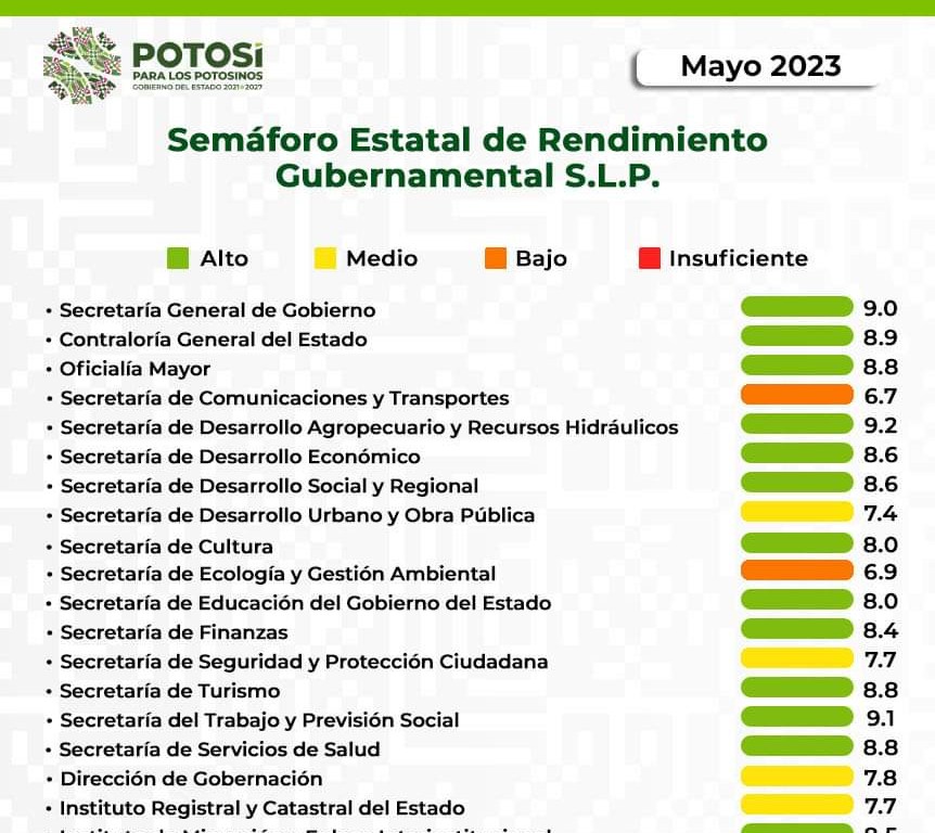 Este miércoles el Gobernador de San Luis Potosí, Ricardo Gallardo Cardona, dio a conocer la nueva evaluación del Semáforo Estatal de Rendimiento Gubernamental, correspondiente al mes de mayo 2023, en la que 32 dependencias obtuvieron un alto desempeño; ocho, nivel medio y solo dos, bajo.
