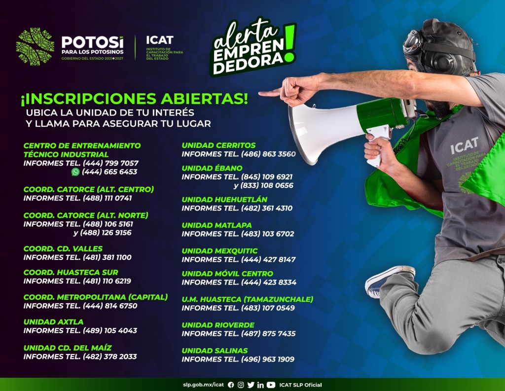 El Instituto de Capacitación para el Trabajo de San Luis Potosí (Icat), arrancará en junio, una campaña gratuita de cursos y talleres en las cuatro regiones del Estado, para que las y los potosinos desarrollen habilidades y se profesionalicen ante el crecimiento económico y la bonanza que se espera en San Luis Potosí en los próximos meses con la llegada de nuevas empresas al Estado y la zona metropolitana.