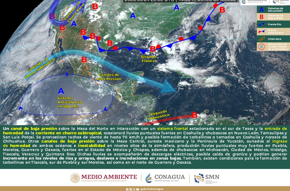 Intervalos de chubascos con lluvias puntuales fuertes (25 a 50 mm): Coahuila, Nuevo León, Tamaulipas, San Luis Potosí, Veracruz, Estado de México, Ciudad de México y Chiapas.