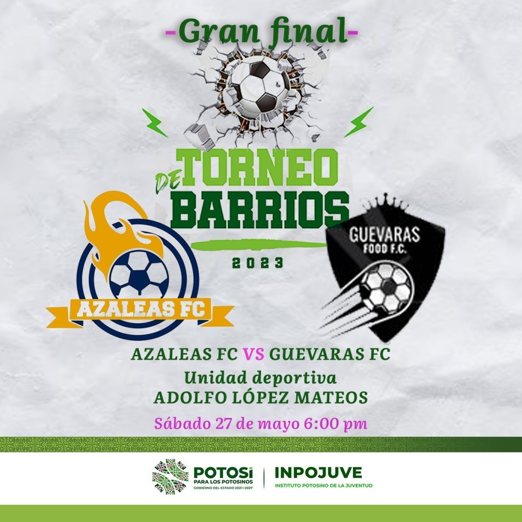 El Instituto Potosino de la Juventud (Inpojuve), invita a la ciudadanía a la gran final del Torneo de Barrios 2023, en el que se enfrentarán Azaleas FC y Guevaras FC, como parte de las acciones que promueve el desarrollo integral de las y los jóvenes de las colonias de la zona metropolitana, a través de la integración y un ambiente de sana convivencia.