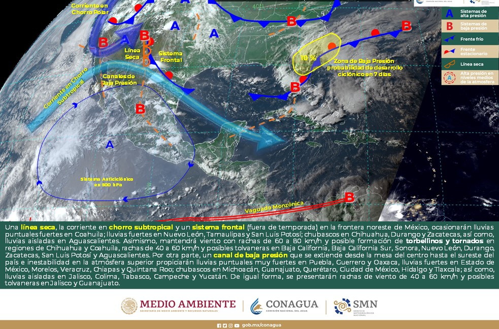 Viento con rachas de 40 a 60 km/h y posibles tolvaneras: Baja California, Baja California Sur, Sonora, Coahuila, Nuevo León, Tamaulipas, Durango, Zacatecas, San Luis Potosí, Aguascalientes, Jalisco, Guanajuato, Michoacán y Oaxaca (Istmo).