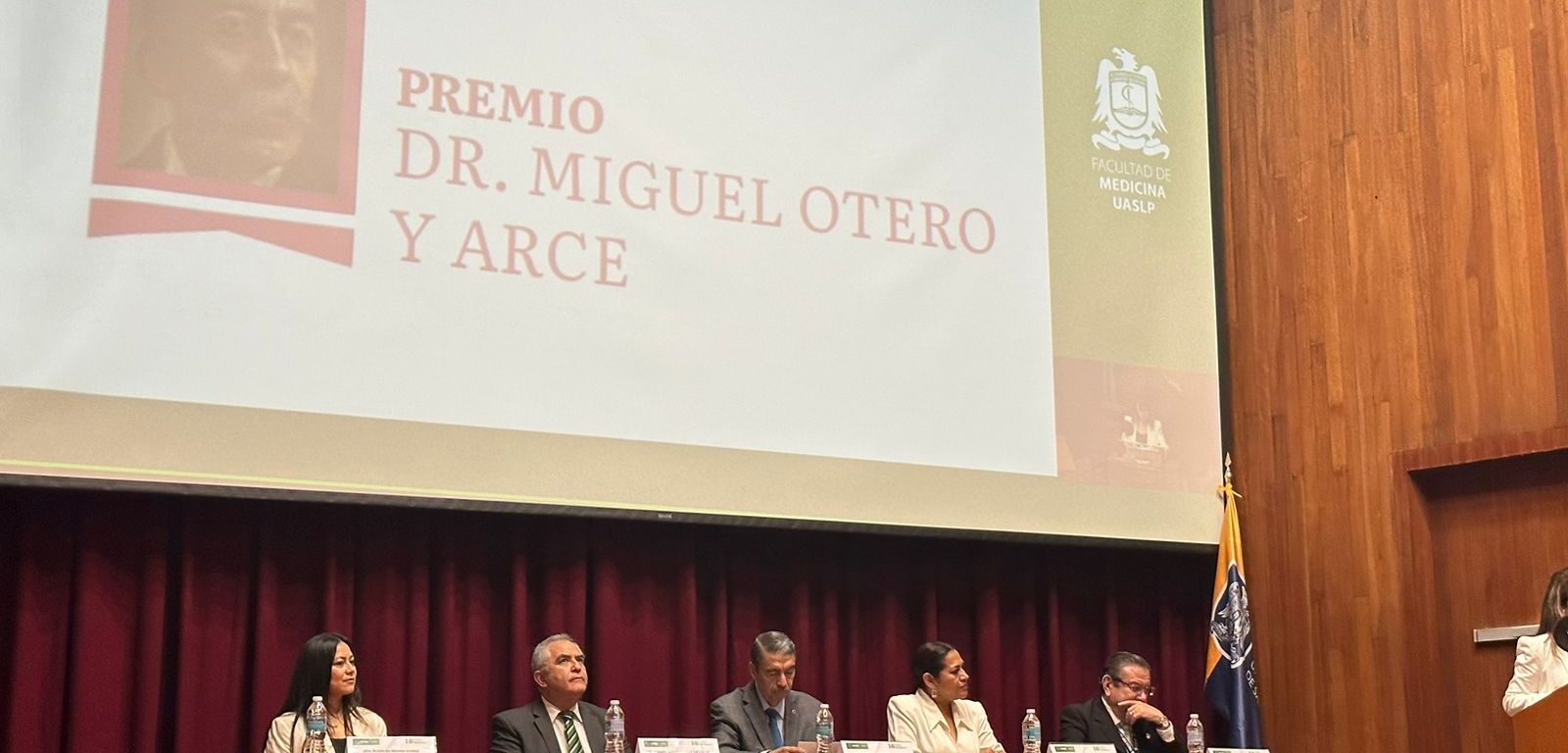 Acosta Díaz de León recibió el premio “Miguel Otero y Arce”, por parte de la Universidad Autónoma de San Luis Potosí (UASLP), en el marco de la inauguración del 16vo. Foro Estatal Interinstitucional de Bioética e Investigación en Salud, donde refrendó el compromiso del Gobierno del cambio con las y los investigadores, estudiantes y personal de salud.