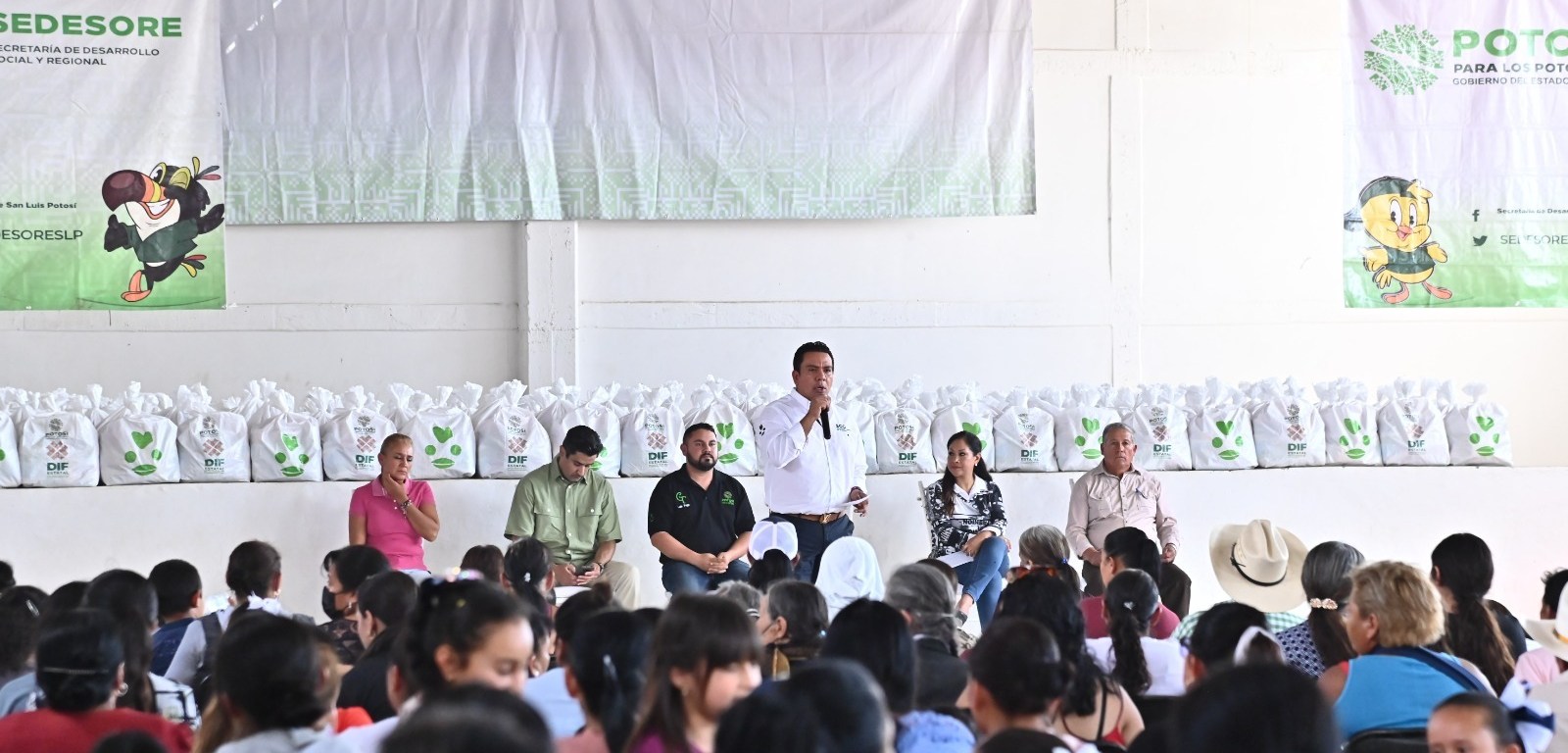 La entrega fue supervisada por el titular de la Secretaría General de Gobierno (SGG), J. Guadalupe Torres Sánchez, quien ante cientos de beneficiarios de la comunidad El Cúcamo, afirmó que la instrucción del Mandatario Estatal, es implementar este programa alimentario que se complementa con otros apoyos como tortillas subsidiadas y purificadoras de agua, diseñados como parte de la cruzada contra la pobreza, mismos que gracias al Gobierno del cambio fueron institucionalizados, por lo que por derecho las y los potosinos accederán a ellos.