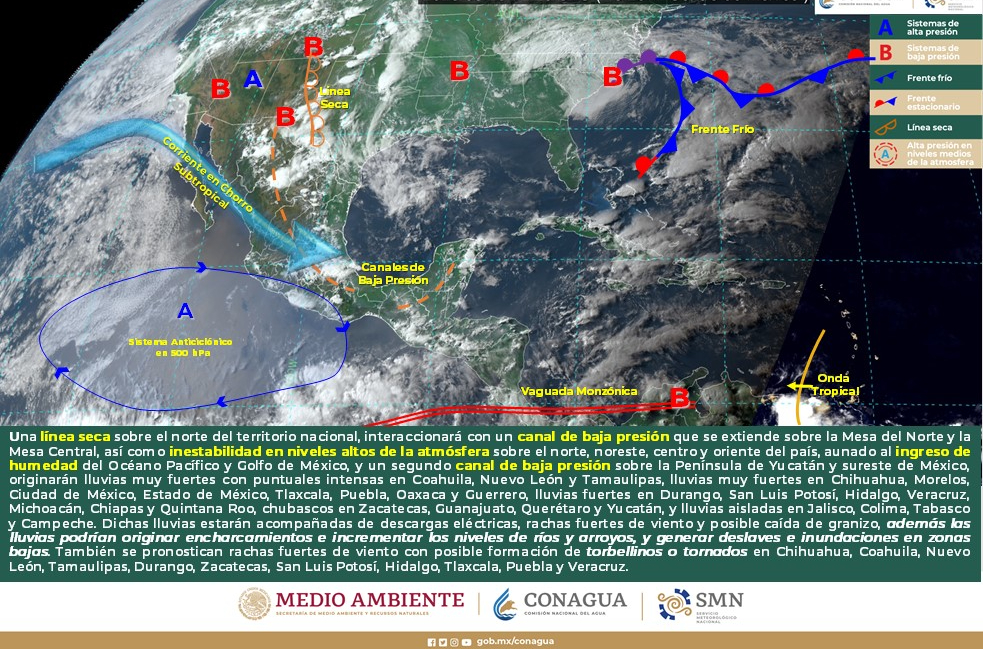 Viento con rachas de 40 a 60 km/h y posibles tolvaneras: Baja California, Baja California Sur, Sonora, Chihuahua, Coahuila, Nuevo León, Tamaulipas, San Luis Potosí, Zacatecas, Durango, Aguascalientes, Jalisco y Guanajuato.