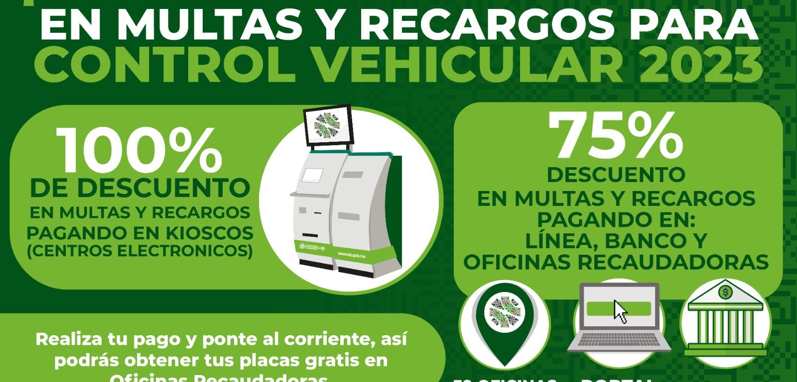 Durante el mes de junio, la Secretaría de Finanzas (Sefin), aplicará el 100 por ciento de descuento en multas y recargos en el trámite de control vehicular en kioscos digitales, y el 75 por ciento para quienes realicen este trámite en línea, banco u oficina recaudadora, a fin de apoyar la economía de las familias y de que más potosinas y potosinos accedan al programa de placas gratuitas.
