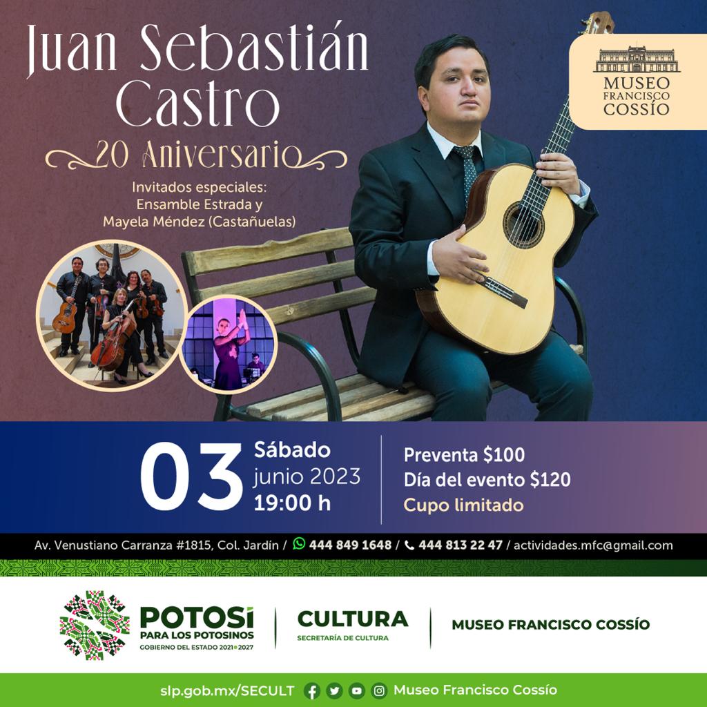 En el marco de su 20 Aniversario, el guitarrista potosino Juan Sebastián Castro se presentará este sábado 03 de junio en las instalaciones del Museo Francisco Cossío con el Ensamble Estrada y Mayela Méndez en las castañuelas. Esta actividad se suma a la serie de actividades que realiza la Secretaría de Cultura de Gobierno del estado, a través del Museo Francisco Cossío para apoyar a artistas y creadores y de esta forma promover la cultura en todas sus expresiones.