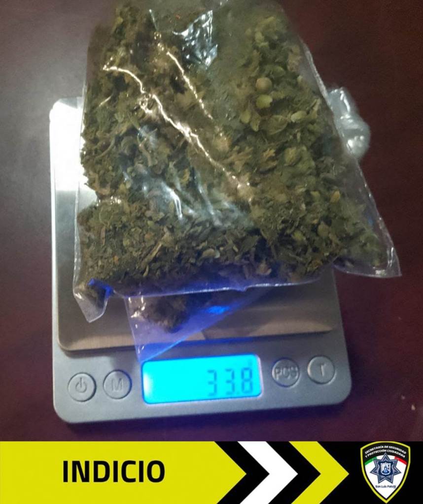 De esta manera, el implicado fue encontrado en posesión de dos bolsas de plástico con hierba verde seca, similar a la marihuana, con un peso de 33.8 gramos.