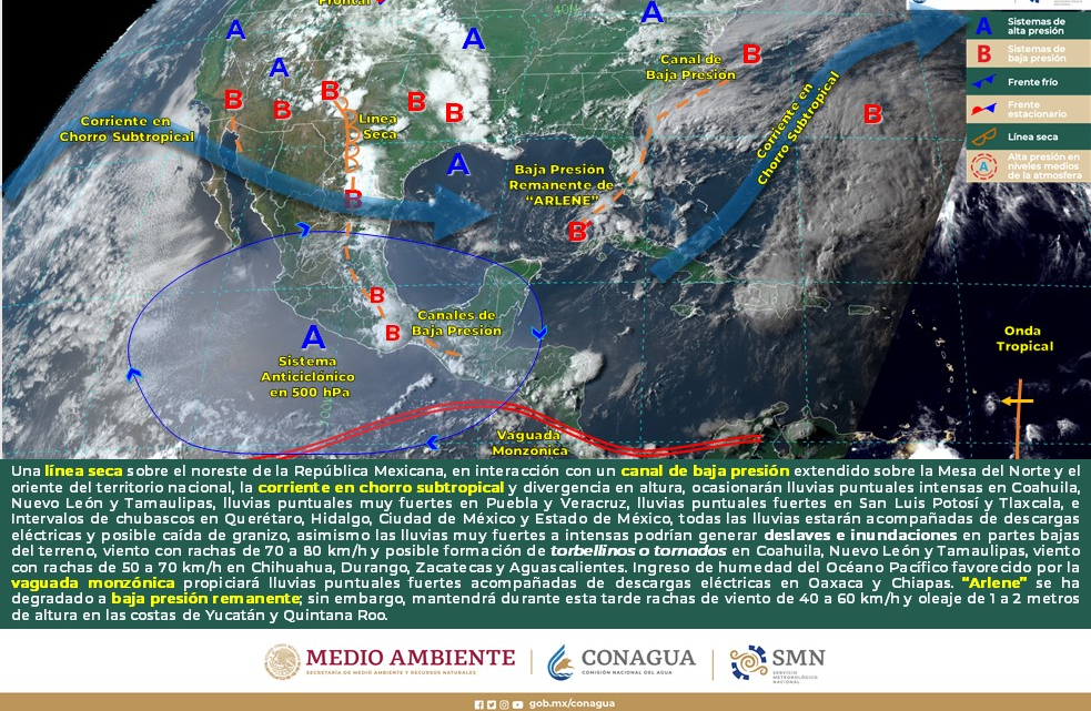 Viento con rachas de 40 a 60 km/h y posibles tolvaneras: Baja California, Baja California Sur, Sonora, Nuevo León, Tamaulipas, San Luis Potosí, Zacatecas, Aguascalientes, Jalisco, Michoacán, Guanajuato, Querétaro, Hidalgo, Puebla, Tlaxcala y Estado de México.