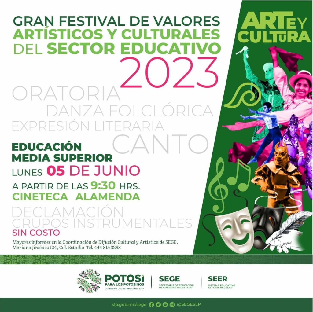 La Secretaría de Educación de Gobierno del Estado (SEGE), lleva a cabo el primer Gran Festival de valores artísticos y culturales del 02 al 09 de junio, con la participación de 200 estudiantes de educación media superior, para retomar y fortalecer los aprendizajes que durante años se abandonaron por la pandemia.