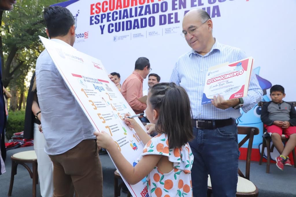 En el Parque de Morales, el Presidente Municipal de la Capital, Enrique Galindo Ceballos, les pidió cumplir con esta misión fundamental, para afrontar la crisis de agua que existe en la ciudad de San Luis Potosí. “Los adultos no hemos sufrido por agua, pero si a los niños no los entrenamos y los convertimos en una generación cuidadora del agua, San Luis Potosí va a vivir una situación grave. Hoy, el Día Mundial del Medio Ambiente, este Escuadrón es la mejor manera de cerrar filas para cuidar nuestro planeta”.