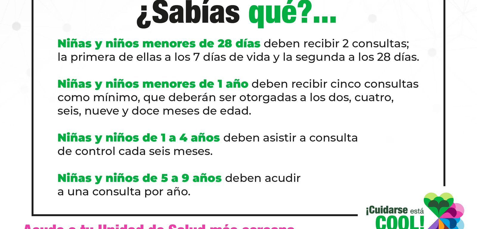 En su unidad de salud correspondiente, las niñas y niños tienen derecho a recibir el servicio de vigilancia y seguimiento durante la infancia, se llama la Consulta de Niño Sano, ya que a las niñas y niños se les debe llevar a consulta médica aunque no estén enfermos; y las visitas médicas en los recién nacidos deben ser a los 7 y a los 28 días.