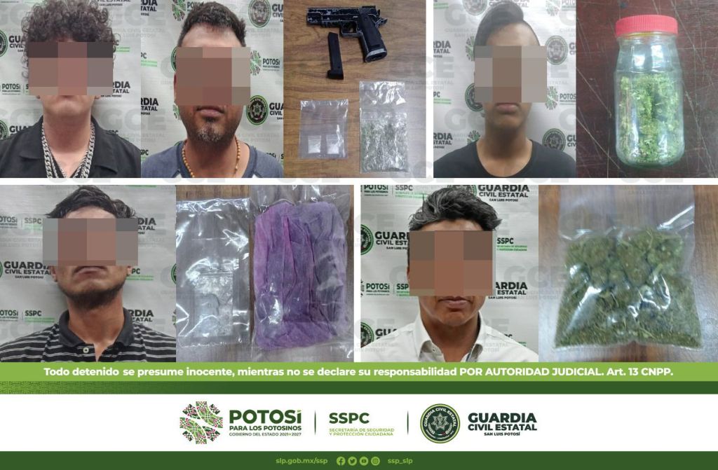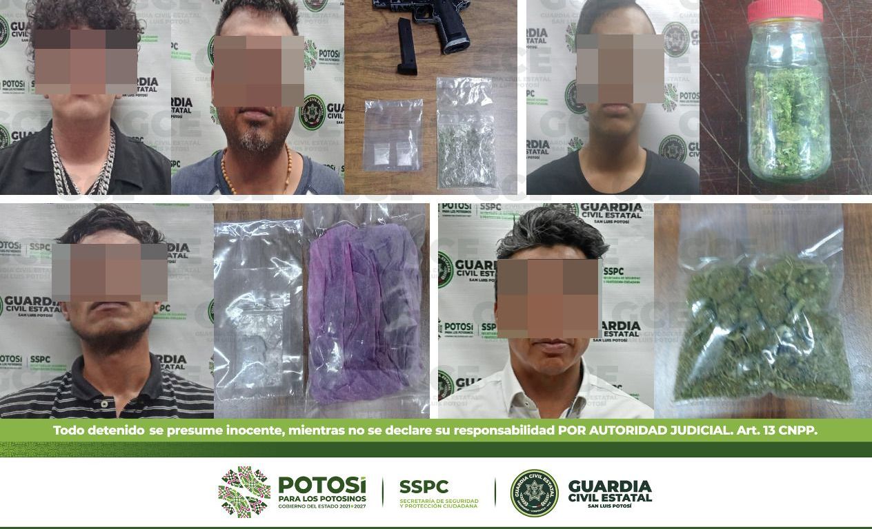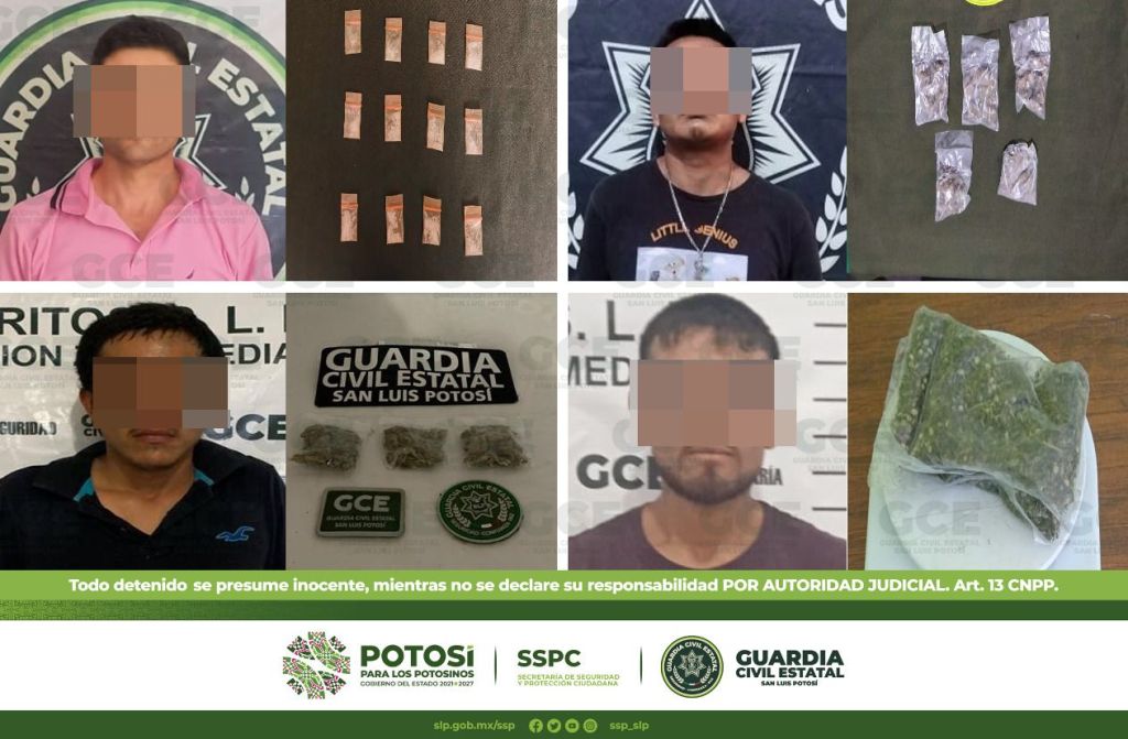 Gracias a los operativos implementados en los 58 municipios del estado de San Luis Potosí para el combate a la delincuencia y la inhibición de la comisión de ilícitos, agentes de la Guardia Civil Estatal aseguraron a 20 personas en distintos hechos por posesión de estupefacientes.