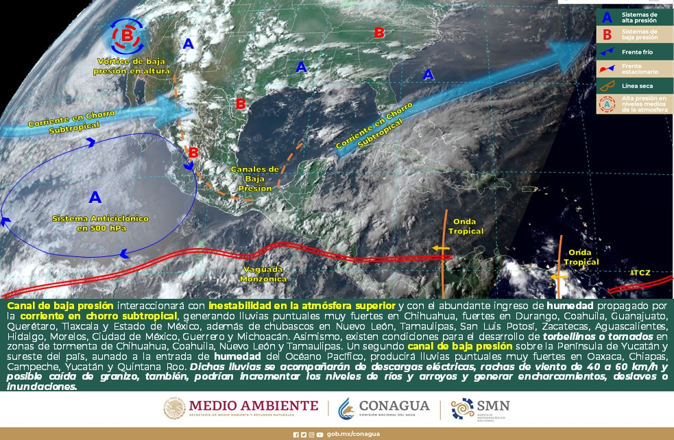 Intervalos de chubascos con lluvias puntuales fuertes (25 a 50 mm): Coahuila, Nuevo León, Tamaulipas, Puebla, Veracruz, Oaxaca, Yucatán y Quintana Roo.