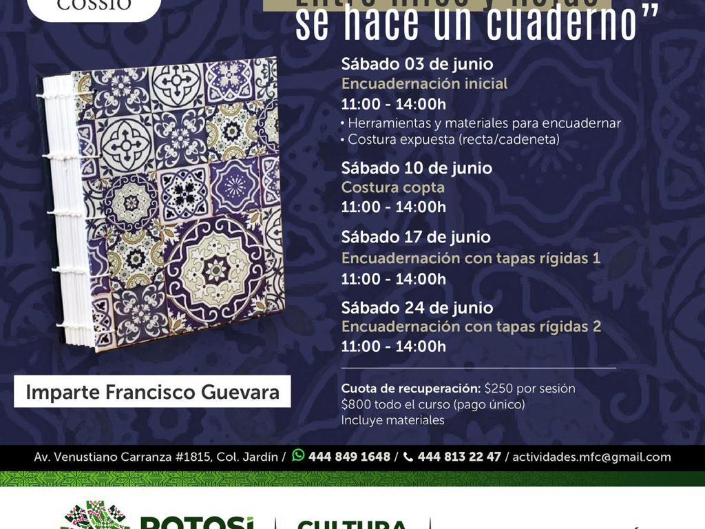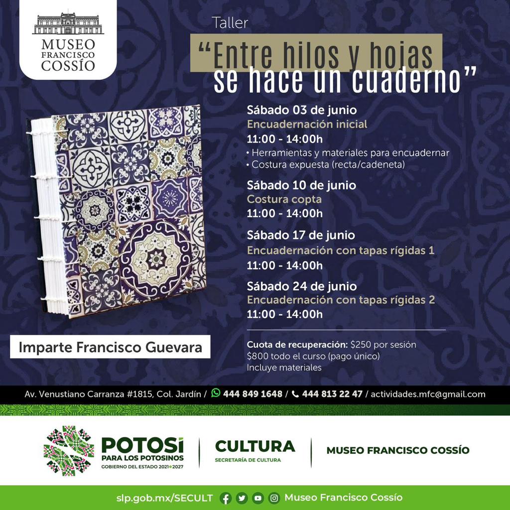 La Secretaría de Cultura de San Luis Potosí invita al público en general a participar en la segunda sesión del taller de encuadernación “Entre hilos y hojas se hace un cuaderno”, que se llevará a cabo en el Museo Francisco Cossío el sábado 10 de junio de 11:00 a 14:00, y será impartido por Francisco Guevara, quien cuenta con amplia experiencia y conocimiento sobre la encuadernación; cada sesión del taller tendrá una cuota de recuperación de $250, la cual incluye todos los materiales.