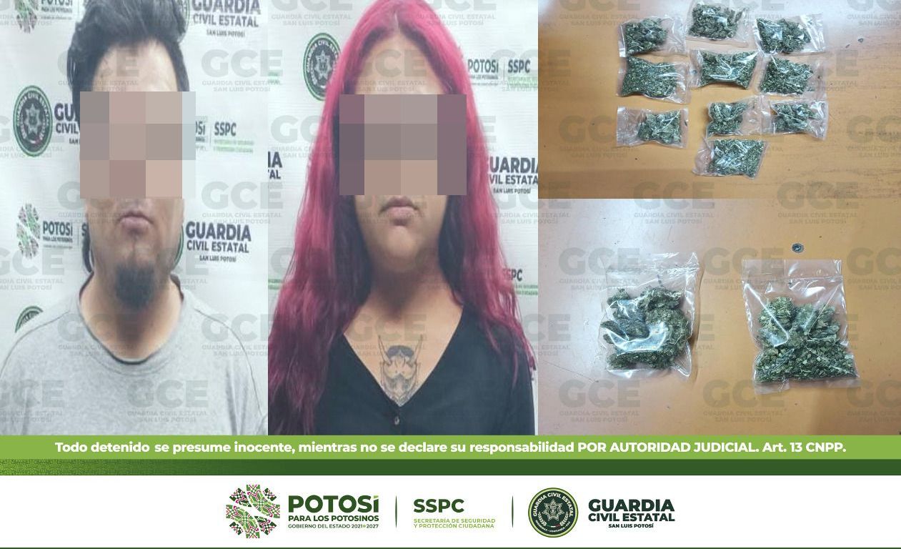 Los agentes de la GCE lograron asegurar a Daniel “N” de 36 años y a Estefanía “N” de 24 años con 12 bolsas de marihuana, identificados como presuntos distribuidores de enervantes en la zona.