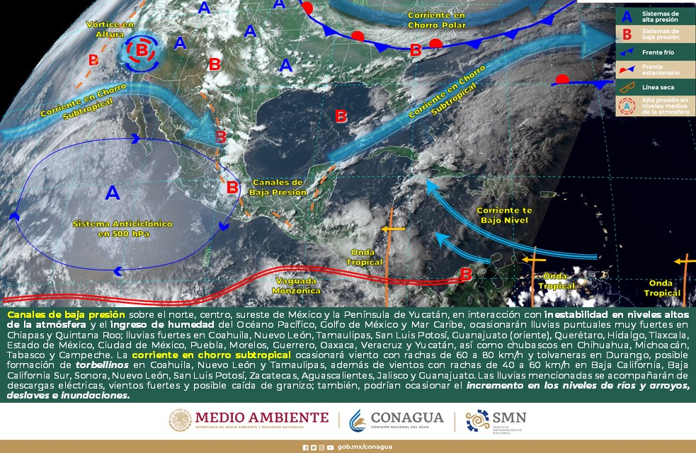 Intervalos de chubascos (5 a 25 mm): Coahuila, Nuevo León, Tamaulipas, San Luis Potosí, Veracruz, Hidalgo, Tlaxcala, Estado de México, Ciudad de México, Morelos, Guerrero, Campeche y Quintana Roo.