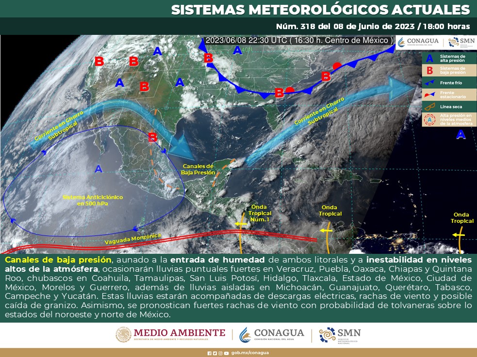 Lluvias aisladas (0.1 a 5 mm): San Luis Potosí, Querétaro, Hidalgo, Tlaxcala, Michoacán, Campeche y Yucatán.