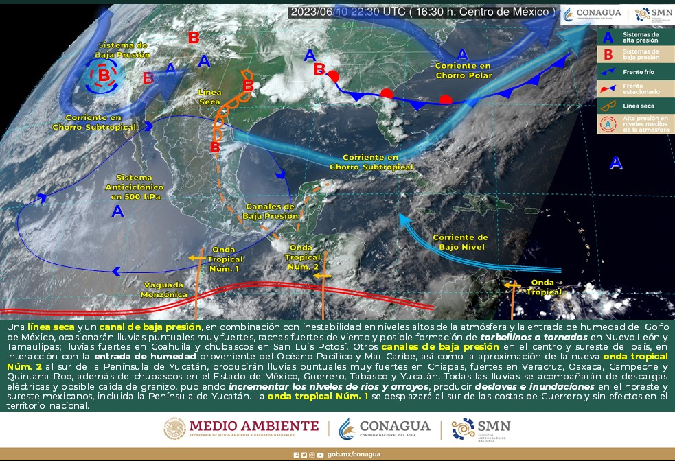Intervalos de chubascos (5 a 25 mm): Tamaulipas, San Luis Potosí, Jalisco, Guanajuato, Querétaro, Ciudad de México, Michoacán, Guerrero, Campeche, Yucatán y Quintana Roo.