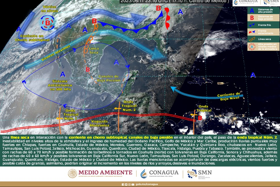 Viento con rachas de 40 a 60 km/h y posibles tolvaneras: Baja California, Baja California Sur, Sinaloa, Durango, Coahuila, Nuevo León, Tamaulipas, San Luis Potosí, Zacatecas, Aguascalientes, Nayarit, Jalisco, Guanajuato, Querétaro, Hidalgo, Estado de México, Ciudad de México, Tlaxcala, Campeche, Yucatán y Quintana Roo.