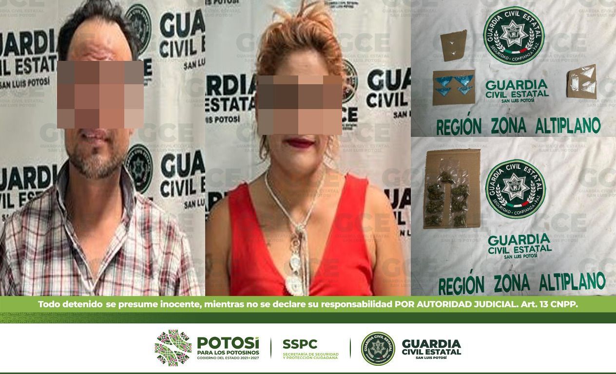 Como parte del Plan Integral de Seguridad implementado en los 58 municipios de la entidad potosina por la Guardia Civil Estatal para inhibir la comisión de ilícitos, se aseguró a una pareja en el municipio de Matehuala con varias dosis de droga.