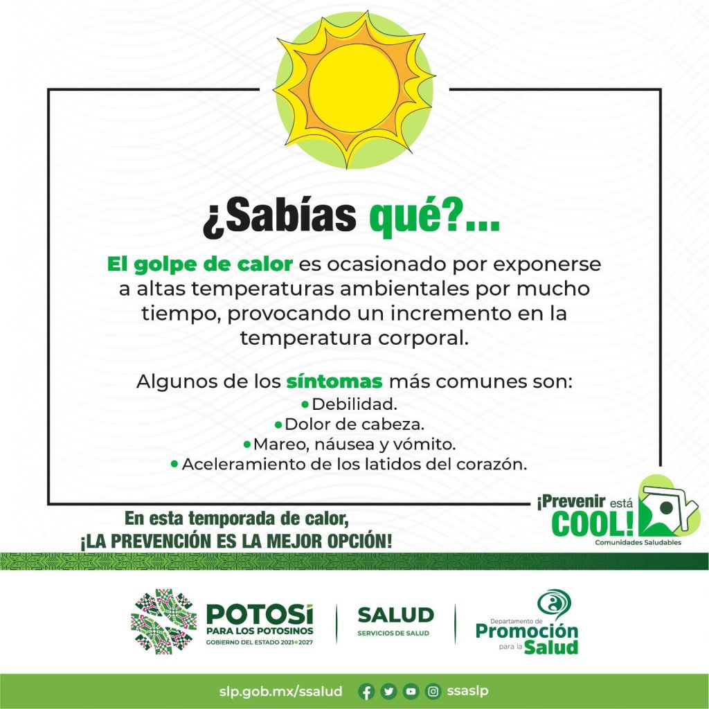 Sobre el golpe de calor, pidió atención a los síntomas como: temperatura mayor a 40 grados, dolor de cabeza, sed, cansancio, piel seca y roja, somnolencia, perdida de la conciencia, calambres, debilidad muscular, náuseas, vómito y convulsiones.
