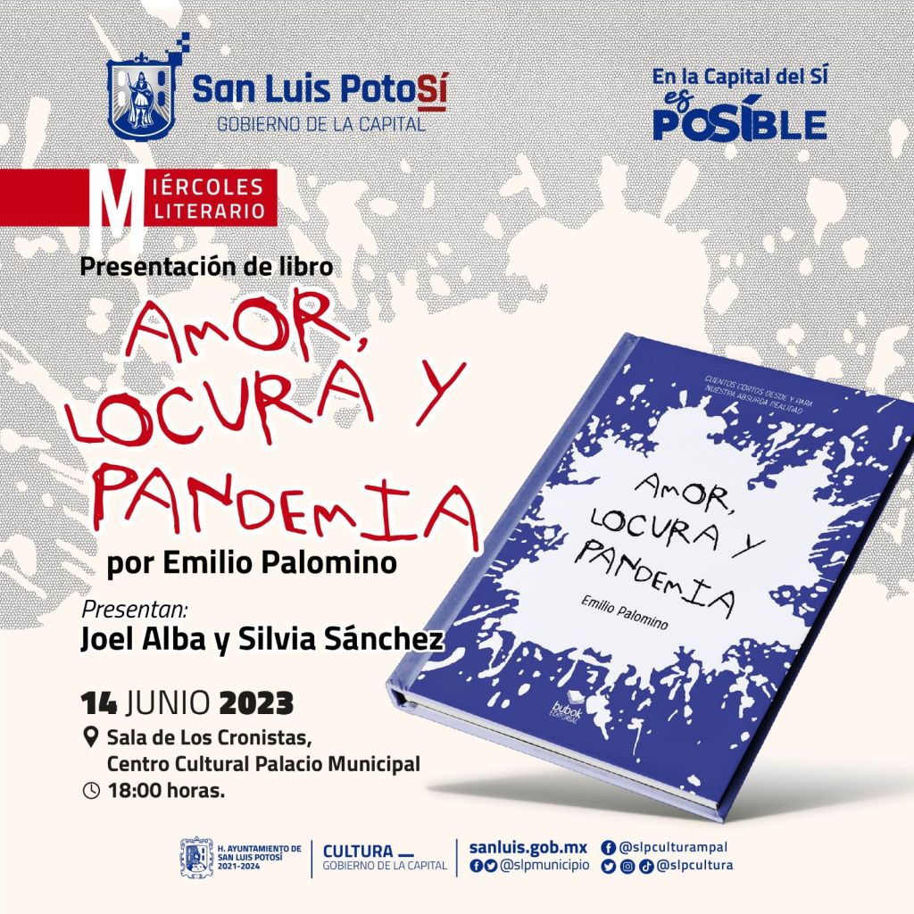 El Gobierno de la Capital invita a la presentación del libro: “Amor, locura, y pandemia”, del escritor Emilio Palomino, en el Miércoles Literario, a celebrarse en la sala de Los Cronistas del Centro Cultural Palacio Municipal este 14 de junio a las 18 horas.