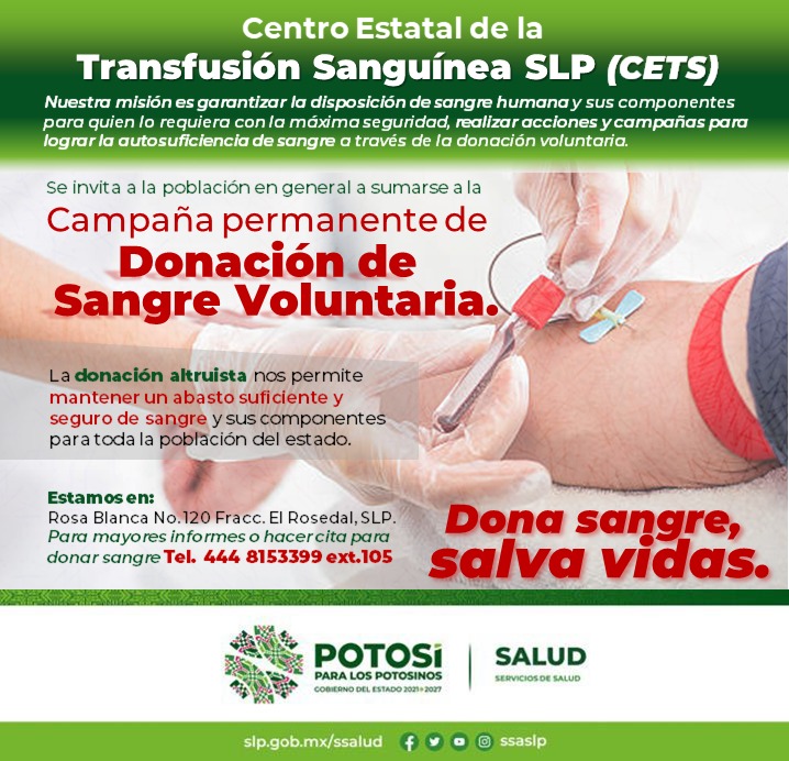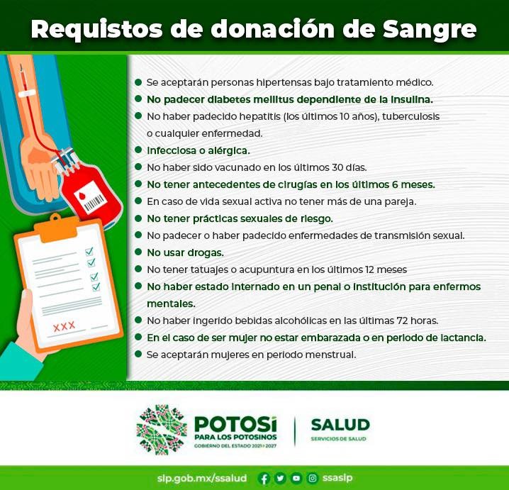 Para mayor información de cómo convertirse en donante de sangre debe ser mayor de 18 años de edad y menor de 65 años, estar sano y presentar identificación oficial, si tienes dudas comunícate al Centro Estatal de la Transfusión Sanguínea 4448153399 o bien agenda tu cita con anticipación en el Banco de Sangre cerca de tu domicilio: Hospital General de Matehuala 4888829931, extensión 29940; Hospital del Niño y la Mujer 4448265005 extensión 23113; Hospital General de Ciudad Valles 4813828170 extensiones 252222,25226, 25228 y 25229; Hospital General de Rioverde, 4878729150 y 4878729151 extensión 28240 y en las instalaciones del Hospital Central.