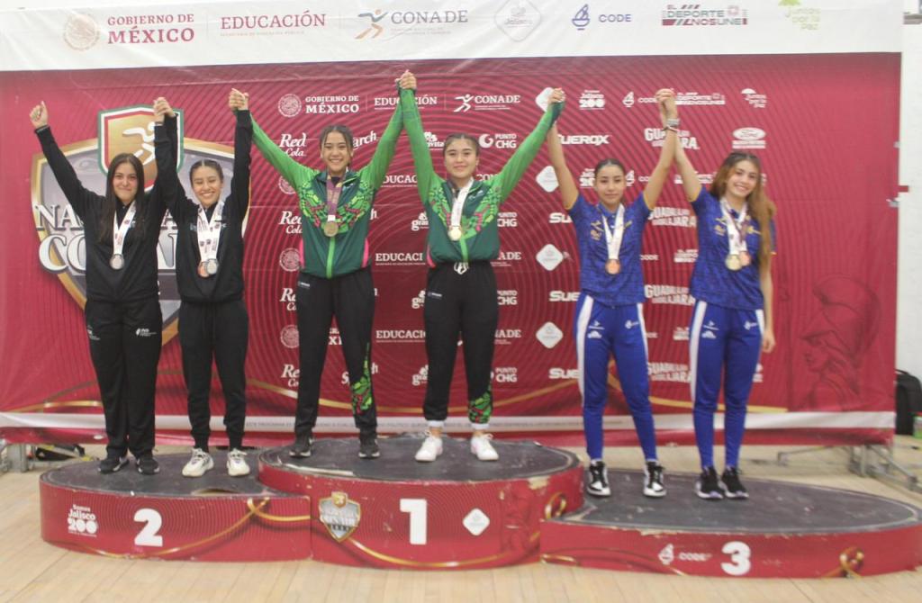 Los oros fueron ganados en la modalidad de Dobles Categoría Sub 19 con Andrea Ximena Arreguín Silos y Bibiana Mendoza Nájera; además en la modalidad Equipos Femenil Categoría Sub 17 con América de Jesús Hernández Mendoza, Georgina Michel García Loredo, Tamara Meza Ruiz y Ana Paula Hernández Rico, quienes también consiguió el metal áureo fueron América de Jesús Hernández Mendoza y Georgina Michel García Loredo en Dobles Sub 17.
