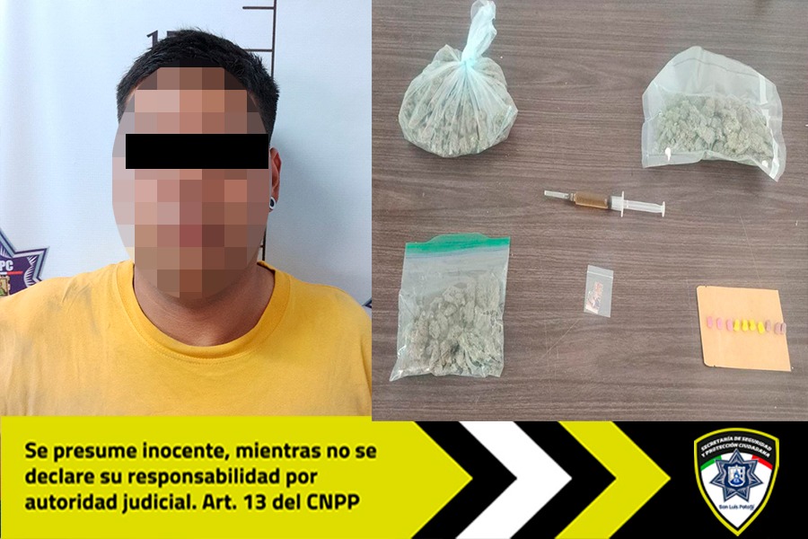 Fue en la calle Ramón Alcorta de la colonia Nuevo Paseo que detuvieron la marcha, donde los oficiales realizaron una revisión preventiva de seguridad, encontrando que el acompañante, de nombre José Gerardo “N” de 25 años, portaba tres bolsas con una hierba verde con características de la marihuana, 10 pastillas y una jeringa con una sustancia tóxica, motivo por el que se le informó de su detención.