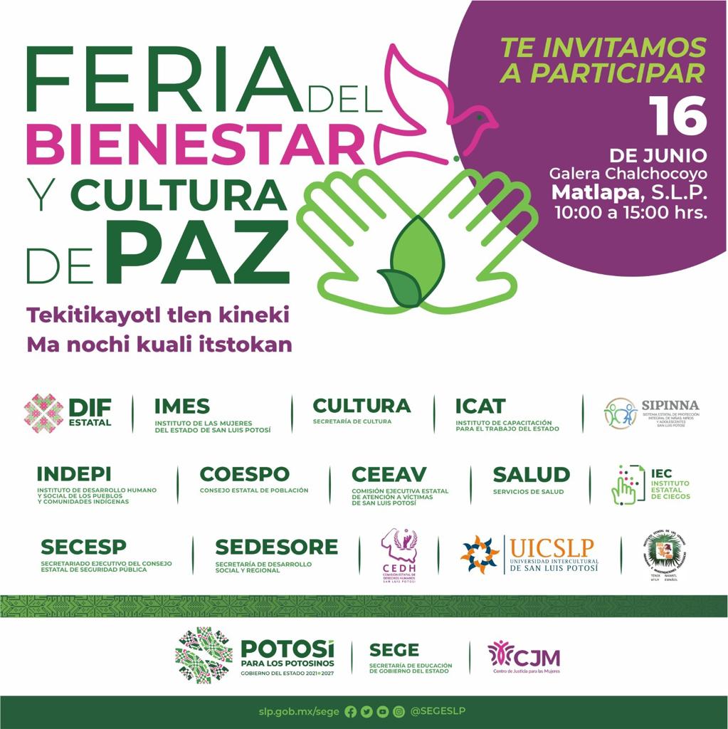 La Secretaría de Cultura de San Luis Potosí, a través del Centro Cultural de la Huasteca Potosina, participará en la Feria del Bienestar y Cultura de Paz que se llevará a cabo este viernes 16 de junio en el municipio de Matlapa a las 10:0 horas, contando con la presencia de la Presidenta de la Junta Directiva del Sistema Estatal del DIF, Ruth González Silva; el Secretario de Educación del Gobierno del Estado, Juan Carlos Torres Cedillo; y la titular del Centro de Justicia para las Mujeres (CJM), Mónica Kemp Zamudio.