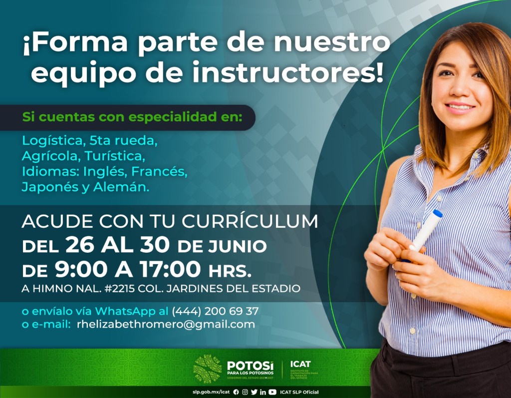 Ante el crecimiento económico que se espera en San Luis Potosí en los próximos meses con la llegada de nuevas empresas, el Instituto de Capacitación para el Trabajo (Icat), realizará una jornada de reclutamiento para instructores del 26 al 30 de junio de 2023, donde las y los interesados podrán acceder a una oportunidad de empleo, integrando el equipo encargado de la profesionalización de potosinas y potosinos.