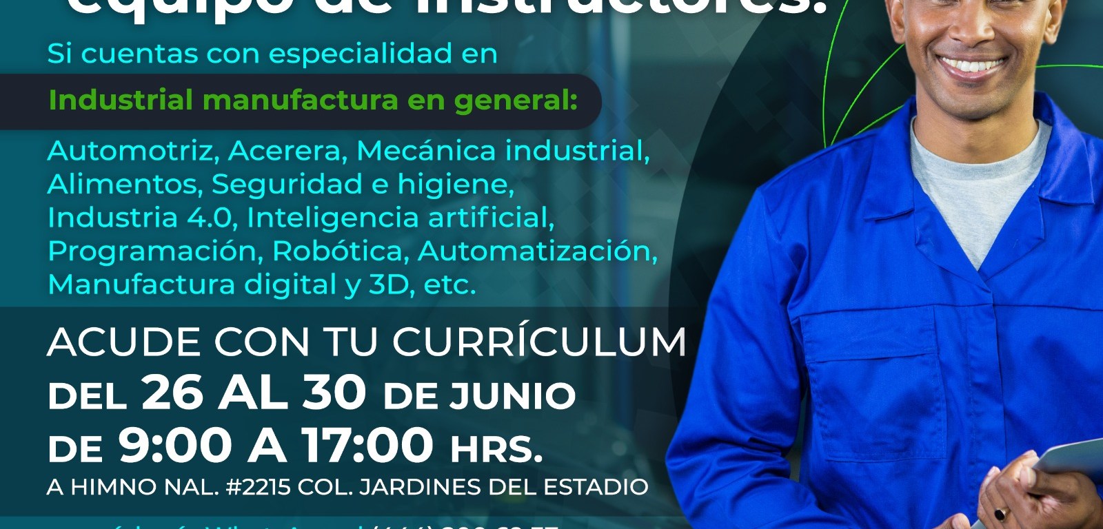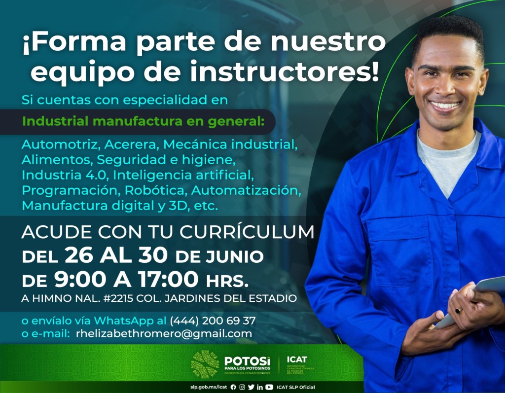 La jornada de reclutamiento de instructores será para las especialidades: Industrial Manufactura en general: Automotriz, Alimentos, Acerera, Mecánica Industrial, Seguridad e Higiene; Industria 4.0; Inteligencia Artificial; Programación, Robótica; Automatización; Manufactura Digital 3D; agrícola o turística; además de idiomas inglés, francés, japonés y alemán. Los interesados deberán presentarse con curriculum en avenida Himno Nacional #2215 Col. Jardines del Estadio, de 09:00 a 17:00 horas. Para mayores informes, (444)102-5700 ext. 302 o al WhatsApp: (444) 200-6937.