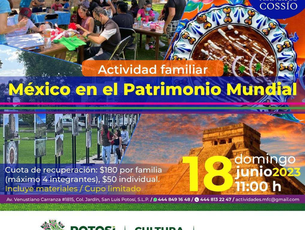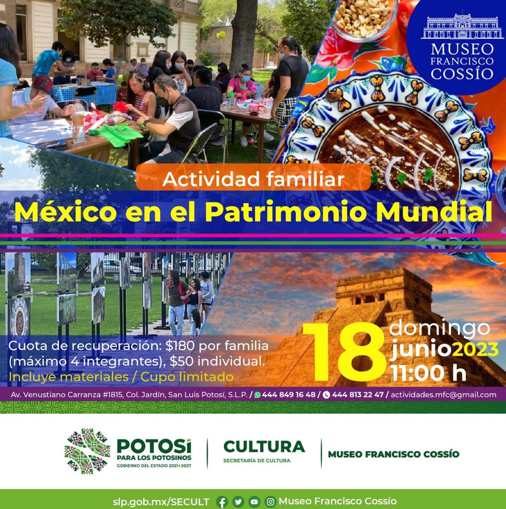 La Secretaría de Cultura de San Luis Potosí, con el fin de difundir las bellezas, costumbres y tradiciones mexicanas, invita al público en general a participar en la Actividad Familiar “México en el Patrimonio Mundial”, que se llevará a cabo este domingo 18 de junio a las 11:00 horas, con una cuota de recuperación de $50 individual y $180 por familia con un máximo de 4 integrantes. La actividad incluye materiales, es de cupo limitado y se solicita registro previo.