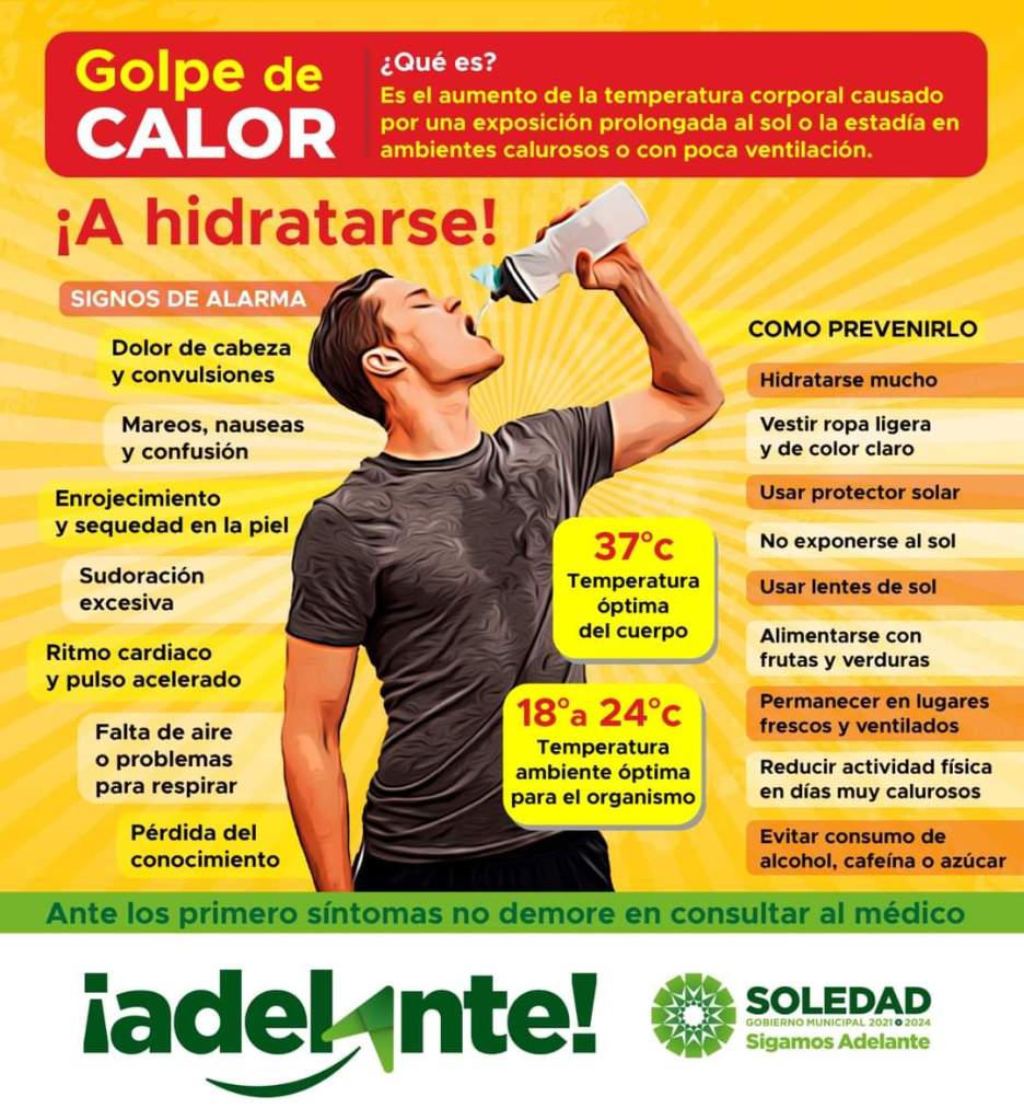 Ante las altas temperaturas que se registran actualmente en el municipio de Soledad de Graciano Sánchez, la coordinación de Servicio Médico exhorta a las personas a fortalecer las medidas preventivas y evitar afectaciones a su salud, mediante el llamado «golpe de calor», expresó su titular, José Rafael Pérez Vázquez.