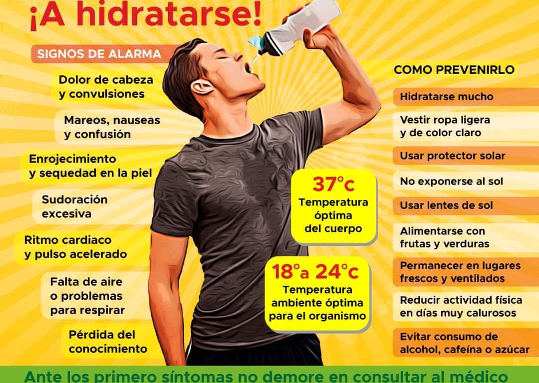 El médico instó, como medida indispensable para cuidar el bienestar físico, mantenerse pendientes de cualquier síntoma que pudiera advertir de algún daño a su salud y acudir de inmediato a recibir atención especializada: mareos, sudoración intensa, dolores de cabeza, calambres, latidos cardiacos, acelerados, piel pálida enrojecimiento y sequedad en la piel, náusea, vómito, falta de aire o problemas para respirar, pérdida de conocimiento y evacuaciones diarreicas.