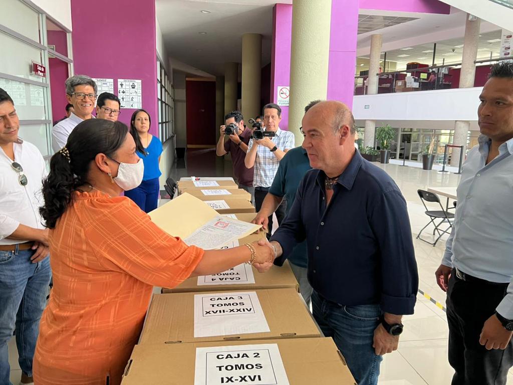 “Se trata de 69 tomos que contienen más de 30 mil firmas que entregaron los ciudadanos, con el fin de tener la validación, que se realice la compulsa de las credenciales para votar, verificar que se encuentren vigentes, no estén repetidas, correspondan a la demarcación y si se cumple de manera suficiente con el 25 por ciento del padrón que dice la ley”.