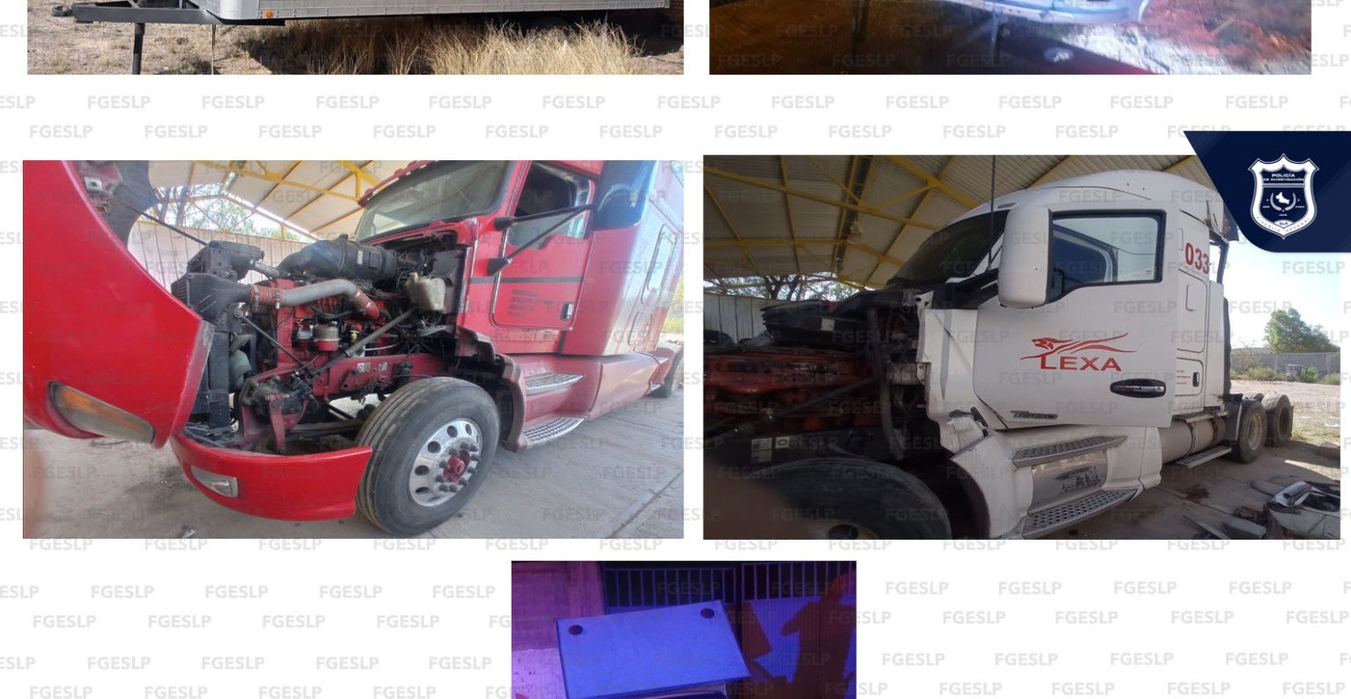 Dentro del inmueble, fueron encontrados dos tractocamiones de la marca Kenworth de color blanco, uno de ellos tiene reporte de robo con violencia en San Miguel de Allende, en el estado de Guanajuato.