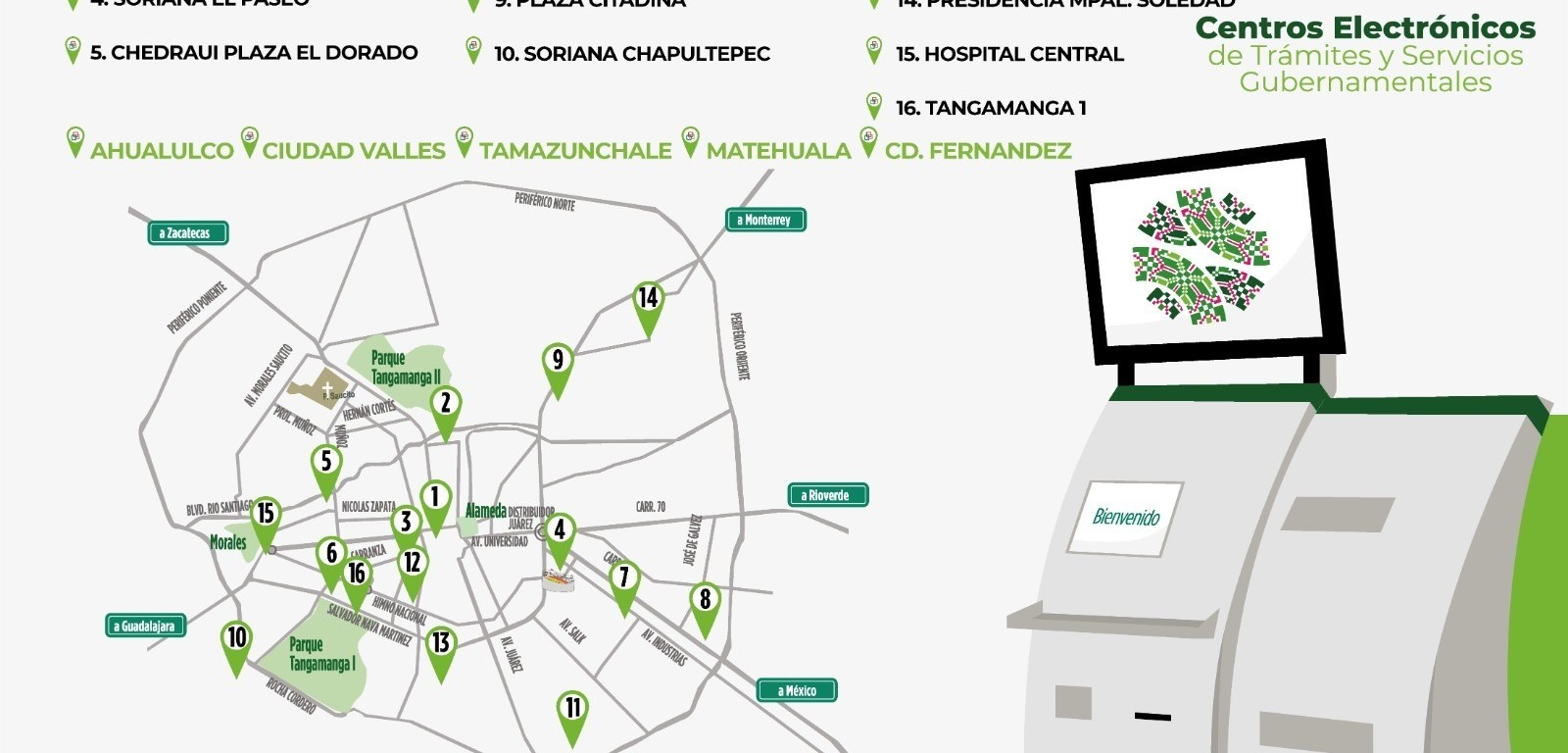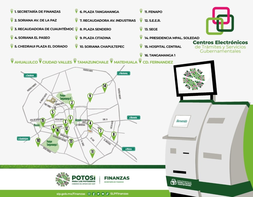 Los 24 centros electrónicos se ubican en: Secretarías de Finanzas y de Educación de Gobierno del Estado (SEGE), Hospital Central, Sistema Educativo Estatal Regular (SEER); plazas Sorianas de avenida de La Paz, El Paseo y Chapultepec, Tangamanga 1, Sendero (dos kioscos), El Dorado y Citadina; Fenapo (cinco kioscos); oficinas recaudadoras de Cuauhtémoc e Industrias; presidencias municipales de Soledad, Matehuala, Ahualulco y Ciudad Fernández; oficinas recaudadoras de Tamazunchale y Ciudad Valles.