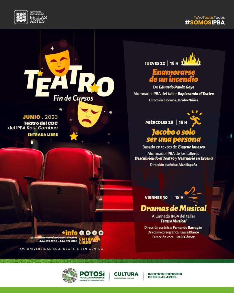 La Secretaría de Cultura de San Luis Potosí, como parte del apoyo que el Gobierno del Estado brinda a nuevos talentos, presenta la temporada de obras de fin de cursos del área de Teatro del Instituto Potosino de Bellas Artes, y que se llevarán a cabo los días 22, 28 y 30 de junio de 2023, todas a las 18:00 horas en el Teatro Marco Antonio Garfias de los Santos del Centro de Difusión Cultural “Raúl Gamboa” del IPBA, con entrada totalmente libre.