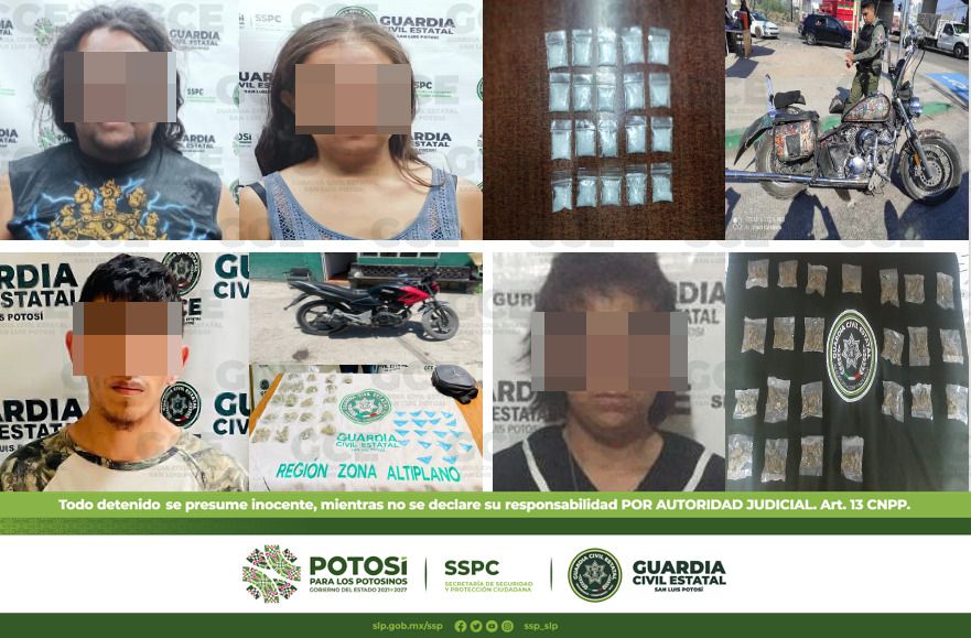 Derivado de los operativos de seguridad desdoblados por elementos de la Guardia Civil Estatal (GCE), en distintas acciones fueron detenidas cinco personas presumiblemente dedicadas a la venta de narcóticos en la Entidad potosina; 107 dosis de diferentes estupefacientes fueron aseguradas.