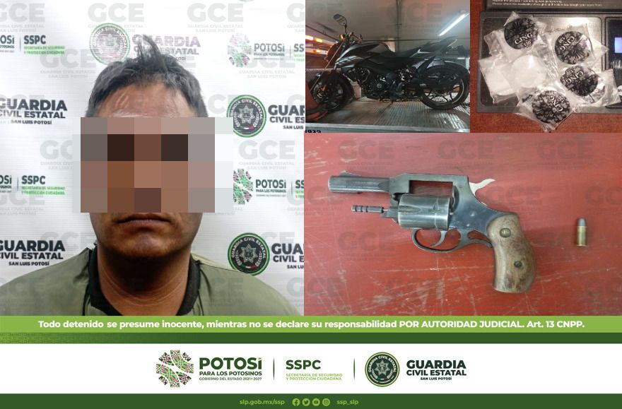 Otro de los hechos tuvo lugar en el municipio de Villa de Reyes, a la altura de la calle Juventud, mediante las labores de inteligencia, autoridades de la GCE lograron la detención de un objetivo criminal, presumiblemente se le vincula a una organización delincuencial. El presunto fue detectado a bordo de una motocicleta sin placas, lo que provocó que le indicaran que detuviera su marcha. Tras verificar el estatus de la unidad marca Bajaj, color gris, modelo 2022, resultó con reporte de robo del año 2022 en la colonia Rincón del Sauce.