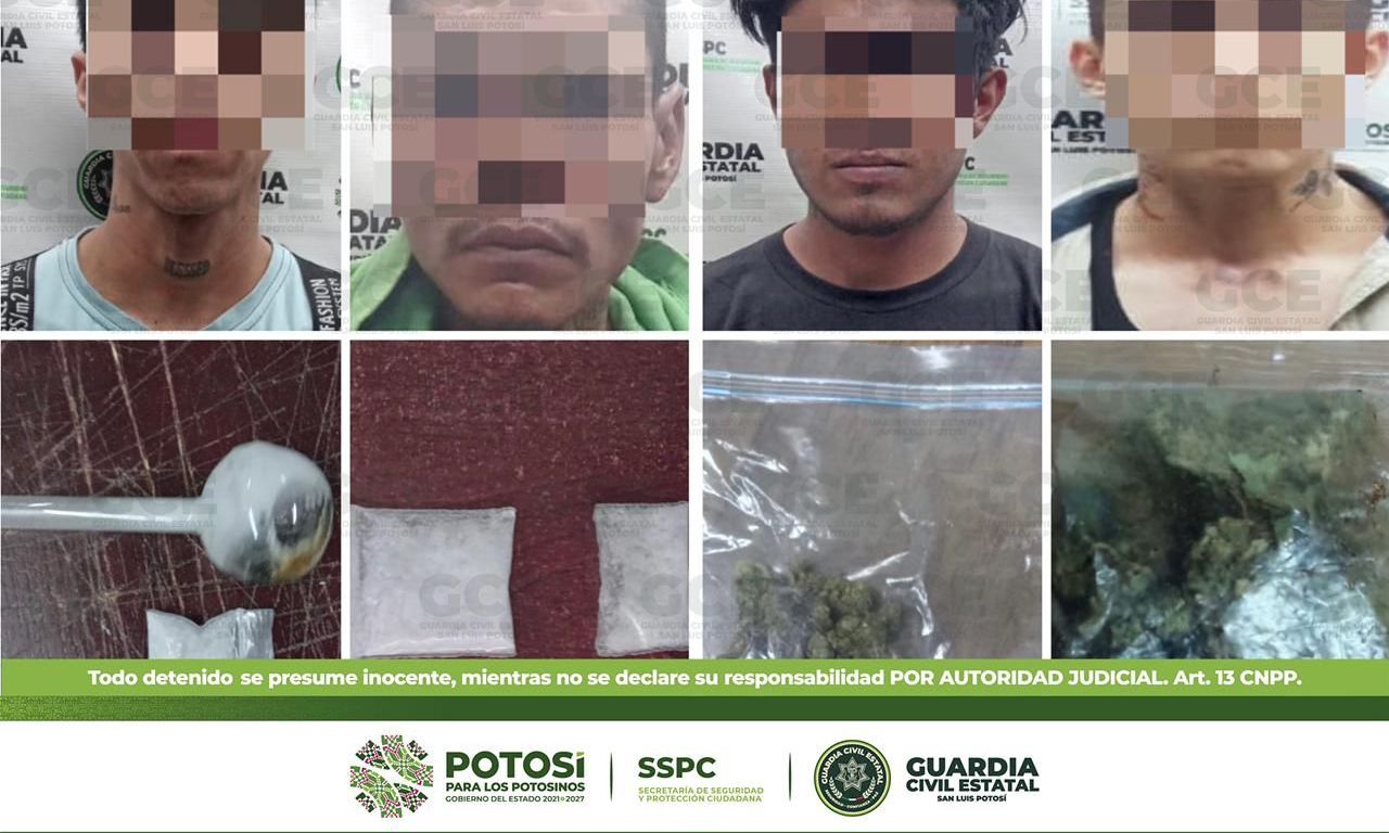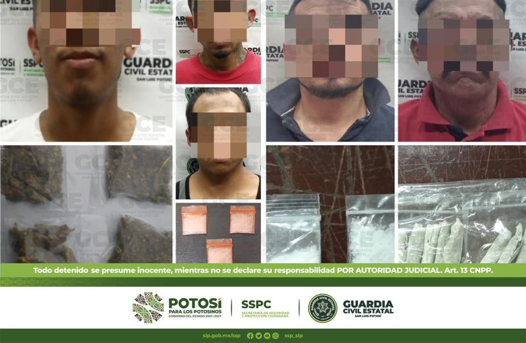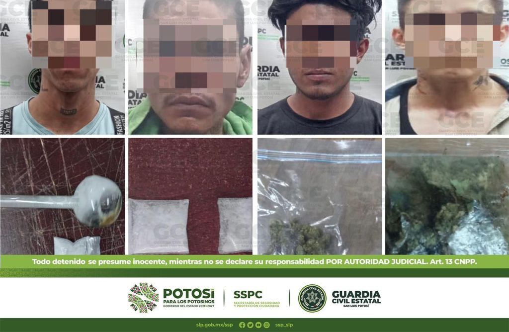 En la zona centro del municipio de Soledad de Graciano Sánchez, elementos de la GCE detuvieron a Martín de 45 años de edad con dos dosis de “cristal”; al interior del estado, tres presuntos fueron arrestados, uno de ellos fue ubicado en el municipio de Ciudad Valles, en el Ejido Ampliación La Hincada, se trata de Jonathan “N” de 25 años, sorprendido con cuatro bolsas con marihuana; continuando con los operativos en el Ejido Puente del Carmen, en el municipio de Rioverde, a Carlos “N” de 25 años le aseguraron dos dosis de “cristal”; por último, en la colonia Libertad, en el municipio de Matehuala, Edwin “N” de 18 años fue aprehendido con 10 dosis de marihuana y cinco de “cristal”.