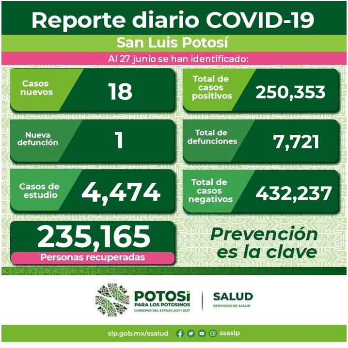 De los nuevos casos, se detectaron 11 en la Jurisdicción Sanitaria I; tres, en la Jurisdicción Sanitaria III de Villa de Pozos; uno, en la Jurisdicción Sanitaria, IV de Rioverde; uno, en la Jurisdicción Sanitaria V de Ciudad Valles; uno, en la Jurisdicción Sanitaria VI de Tamazunchale; uno, en personas residentes de otra entidad y no se presentaron casos nuevos en las siguientes jurisdicciones sanitarias: II de Matehuala y VII de Tancanhuitz.