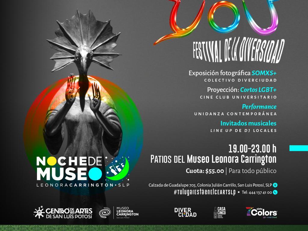 En el marco del Mes del Orgullo y en apoyo a la promoción y reconocimiento de la comunidad LGBTTTIQ+, la Secretaría de Cultura de San Luis Potosí invita a una nueva edición de Noche de Museo: YOU Festival de la Diversidad, que tendrá lugar el viernes 30 de junio, a partir de las 19:00 h, en las instalaciones del Museo Leonora Carrington, ubicado al interior del Centro de las Artes SLP.