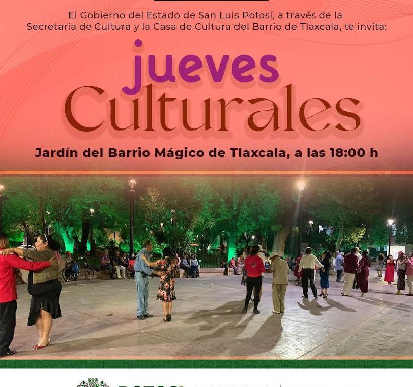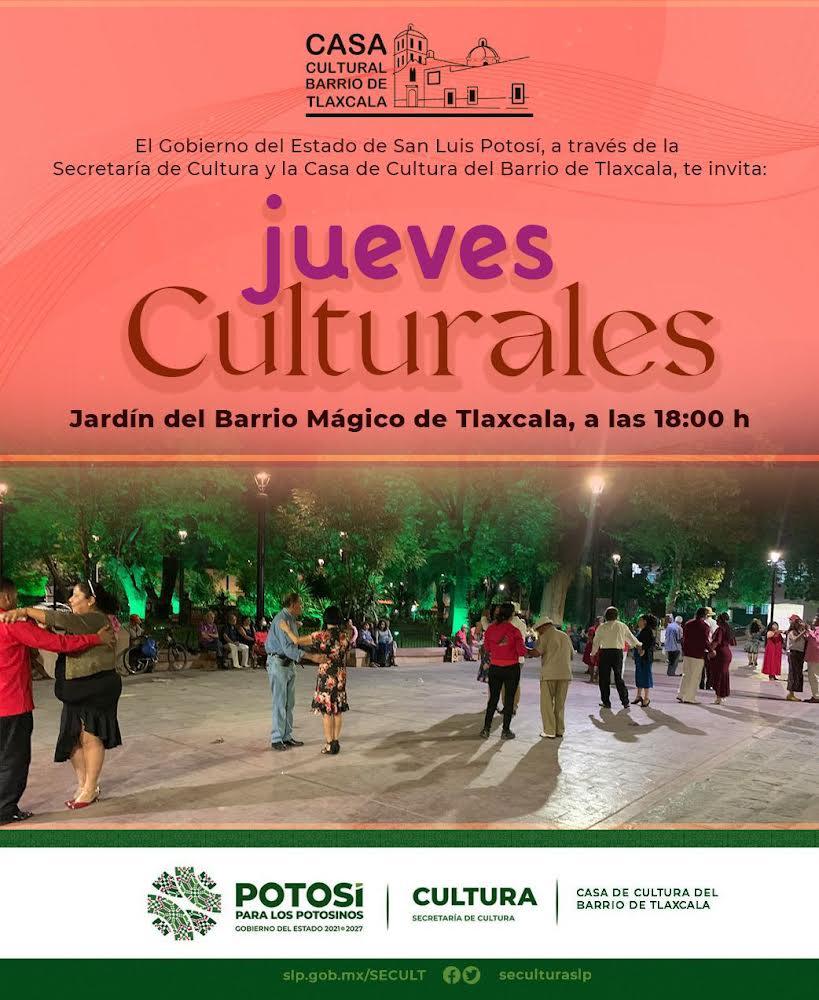 El Gobierno del Estado apoya la promoción y difusión de la cultura en todos los espacios de desarrollo de la comunidad, por lo que la Secretaría de Cultura de San Luis Potosí, invita al público en general a participar en los Jueves Culturales que organiza la Casa de Cultura de Barrio Mágico de Tlaxcala, en el jardín de este lugar.