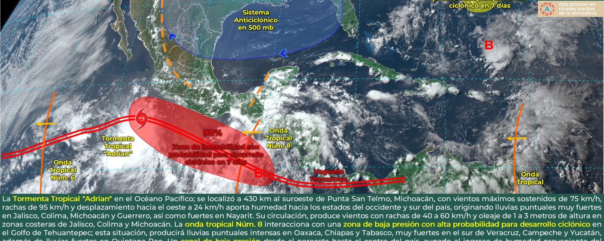 Viento con rachas de 40 a 60 km/h: Campeche y Yucatán; con posibles tolvaneras: Baja California, Baja California Sur, Aguascalientes, Jalisco y Guanajuato.